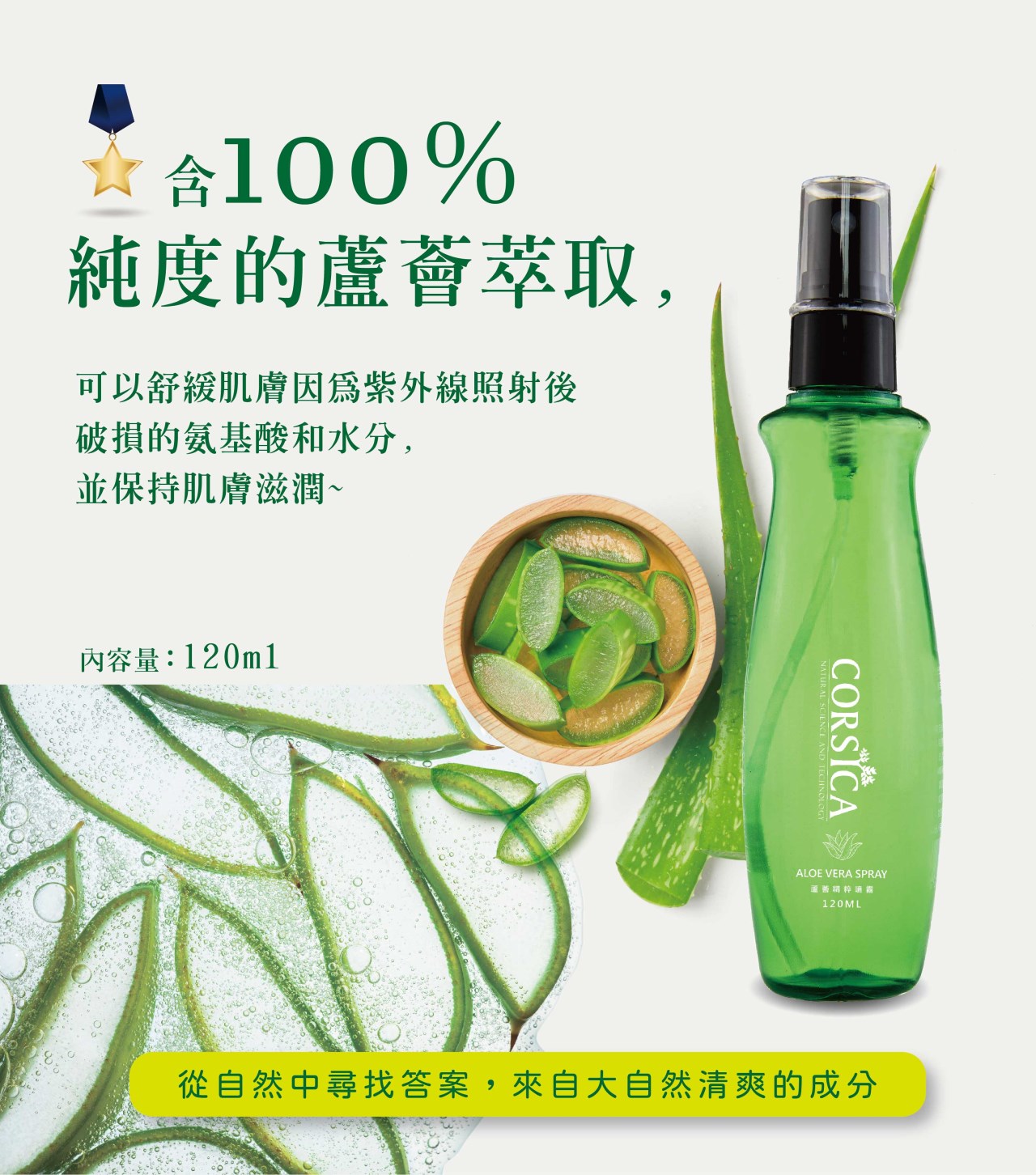 含100%純度的蘆薈萃取,可以舒緩肌膚因為紫外線照射後破損的氨基酸和水分,並保持肌膚滋潤。
