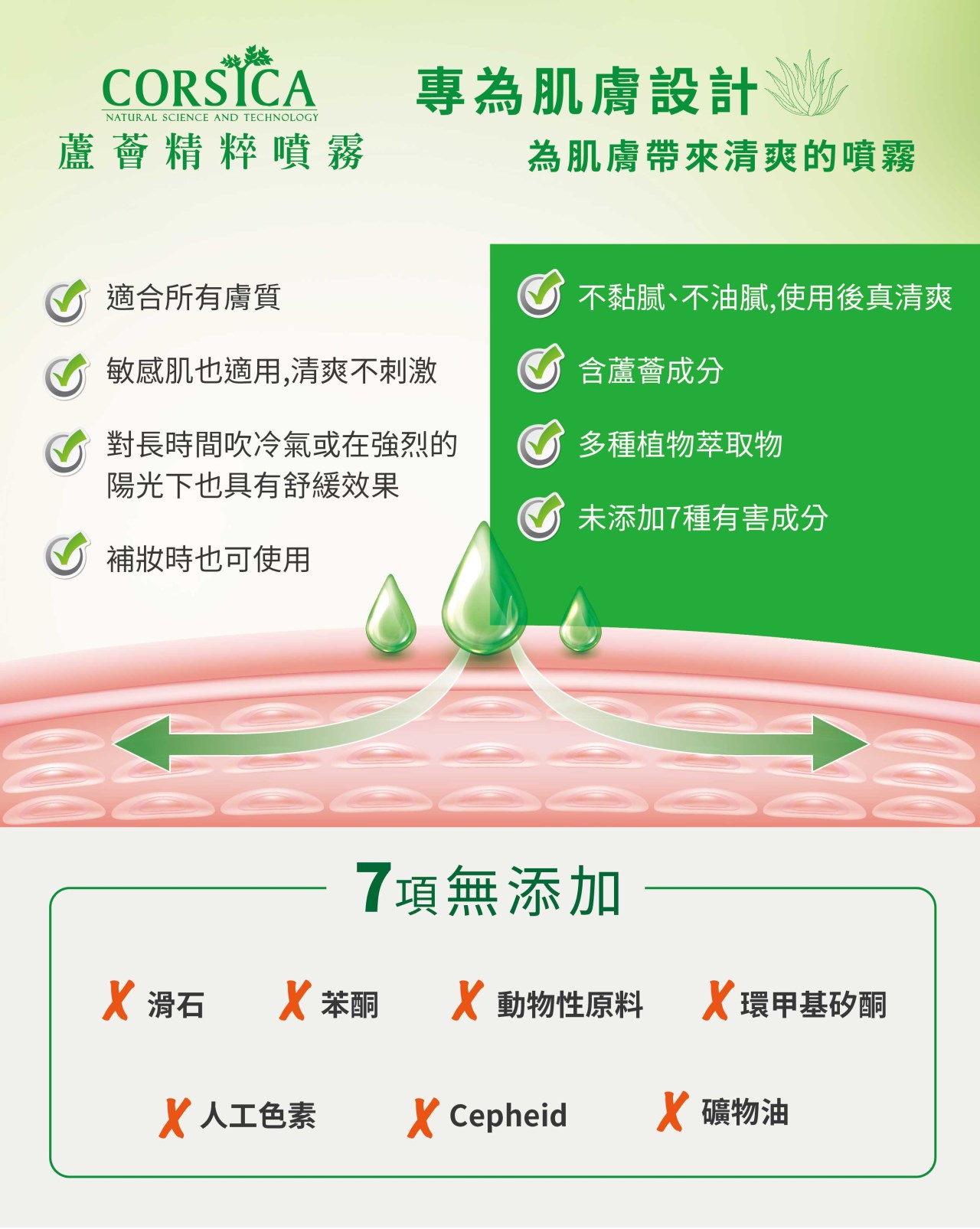 為肌膚帶來清爽的噴霧,適合所有膚質,敏感肌也適用,清爽不刺激,對長時間吹冷氣或在強烈的