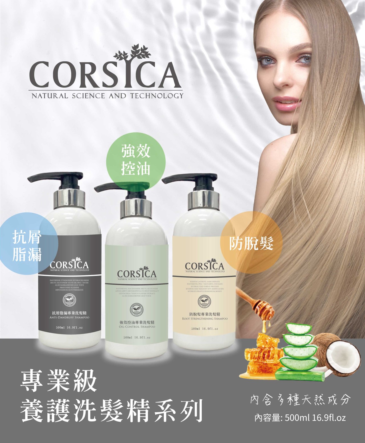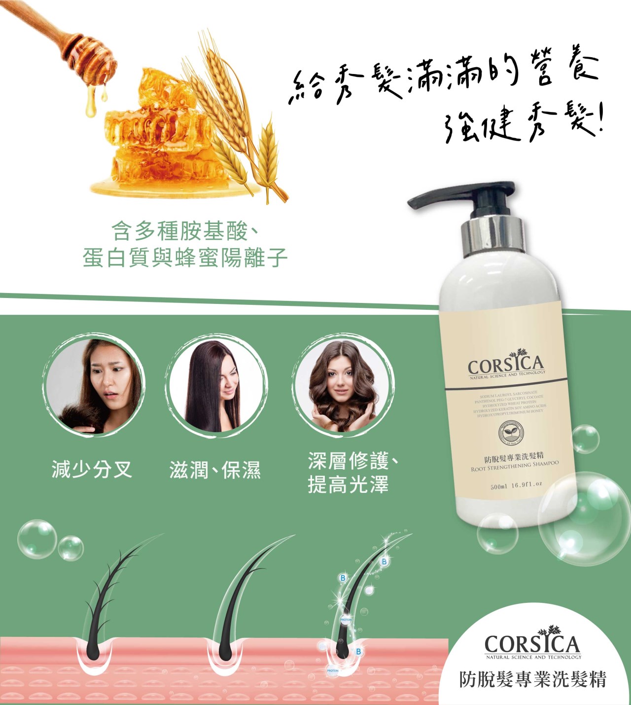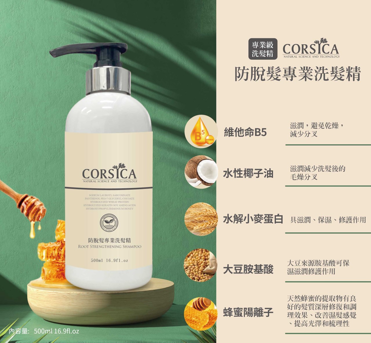 重點成分:溫和胺基酸 ( 滋潤、補充水分 )、維他命B5 ( 滋潤、避免乾燥、減少分叉 )、水性椰子油 ( 滋潤減少洗髮後的毛燥分叉 )、水解小麥蛋白 ( 具調理、滋潤、保濕、修護作用 )、水解角蛋白、大豆胺基酸、米胺基酸、蜂蜜陽離子 ( 天然蜂蜜的提取物有良好的髮質深層修復和調理效果、改善濕髮感覺、提高光澤和梳理性 ),富含多種胺基酸蛋白質跟蜂蜜陽離子的精選成分來調理頭皮及頭髮的健康。